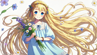 「1人のとても小柄な女性。とても長く明るい金髪、とても長くまっすぐ流れるようなストレートヘアに小さな花飾りをつけている。水色のスモックドレスを着ている。フラワーモチーフのブレスレットをつけている。青い目。顔を赤くして優しく微笑んでいる。花畑に座っている。風で長い金髪がなびいている。とても詳細な描写。アニメ風、アスペクト比は縦長」の絵を描いて。