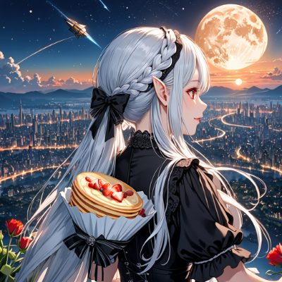 8K,(((masterpiece,best quality,Ultra extremely detailed,perfect anatomy,detailed,high resolution)),((nape of neck,close-up head from back,Child elf wearing sprite detailed gothic lolita dress )),white long hair,opening mouth,smile,blush,lipstick,full fresh lips,big hip,armpit,((red_Eye:1.5, Eye Reflections, reflect strong highlight in eyes)), solo, shining very long white hair dropping,hair_band,bow deeply,holding up many flowers,BREAK,(bouquet),many flowers,sunrise,big planet of earth, moon, many ice creams,((shooting_star)),meteor shower,clouds,city in distance,<lora:hairdetailer:1> <lora:make25d_type1_v100:1>,,
