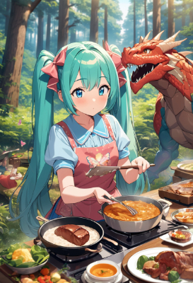 masterpiece, best quality, extremely detailed, anime, girl, skirt,hatsunemiku,vocaloid,twintail,longhair,mini skirt,blue hair,green hair,blue eyes,delicious,retro,clear sky,cooking,forest,monster,dragon,butterfly,flower,blue sky,browned meat,banquet