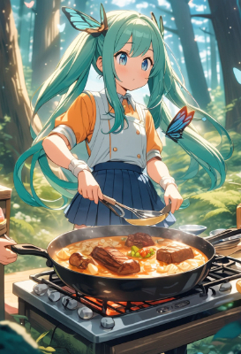 masterpiece, best quality, extremely detailed, anime, girl, skirt,hatsunemiku,vocaloid,twintail,longhair,mini skirt,blue hair,green hair,blue eyes,delicious,retro,clear sky,cooking,forest,monster,dragon,butterfly,flower,blue sky,browned meat,banquet