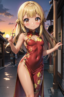 <lora:flat2:-0.5>,<lora:beautiful_detailed_eyes:0.5>,<lora:skin_tone_slider_v1:3.5>,(anime screencap:1.1),(kawaii:1.3),very cute and beautiful teenage,(petite stature:1.5),(blonde twintails:1.3),blunt bangs,(drooping brown eyes:1.2),(medium breasts:1.5),short sleeve hoodie,t-shirt,denim shorts,holding cake,smile,cake buffet,