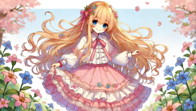 「1人のとても小柄な女性。とても長く明るい金髪、とても長くまっすぐ流れるようなストレートヘアに小さな花飾りをつけている。白のフリルブラウス、フリルとレースの多いピンクのロングスカートを着ている。フラワーモチーフのブレスレットをつけている。襟元にピンクのリボン。青い目。顔を赤くして優しく微笑んでいる。ピンクの靴を履いて花畑に立っている。風で長い金髪がなびいている。とても詳細な描写。アニメ風、アスペクト比は縦長」の絵を描いて。