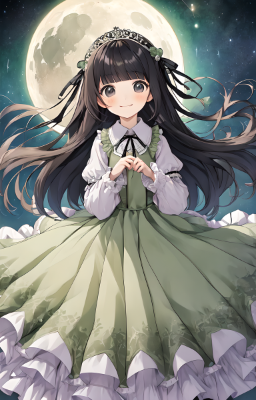 1 girl,(((very longest hair))),smile, Black hair,flowing hair,straight Hair,hair ribbon,mintgreen stripe,Black Eyes,flat chest,straight Across bangs,princess Cut, Very Long Sideburn,roundry Head,Droping eyes,cute,Meekness,Bob Cut,long back hair,12 years old,Victorian age,retro,castle