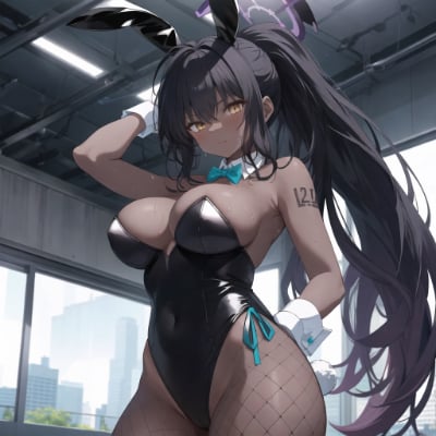 omagarihare,ponytail,cross hair ornament,halo,labcoat,long sleeves,black hoodie,<lora:ba_omagarihare:1>,