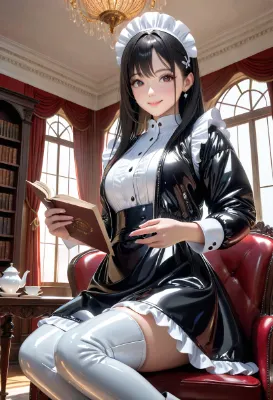 (photorealistic:1.4), (RAW photo), masterpiece, best quality, extremely detailed, lady, neat and clean, French maid costume, white brim, gloves, (shiny down jacket, enamel long boots:1.3), almond shaped drooping eyes, smile, staring, black long hair, mansion, reading room, tea time, <lora:hime_style-1.0r8:0.8>,
