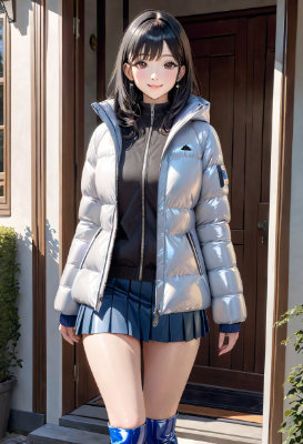 (photorealistic:1.4), (RAW photo), masterpiece, best quality, extremely detailed, lady, neat and clean, (shiny down jacket, enamel knee high boots, gray pleated micro mini skirt:1.3), almond shaped drooping eyes, smile, staring, black long hair, morning, home entrance, outdoors, <lora:hime_style-1.0r8:0.8>,