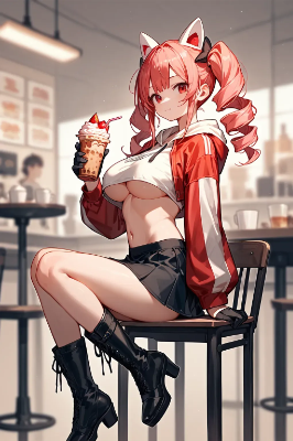 score_9,score_8_up,score_7_up,furled brow,single hair,,a girl holding a Parfait,warking,1girl,solo,holding,breasts,red eyes,jacket,skirt,hoodie,black footwear,mask,high heels,underboob,black skirt,large breasts,black gloves,boots,(detailed background),((depth of field)),(photography),<lora:ColorRoughSlider:-0.8>,extreme close-up,Cafe,