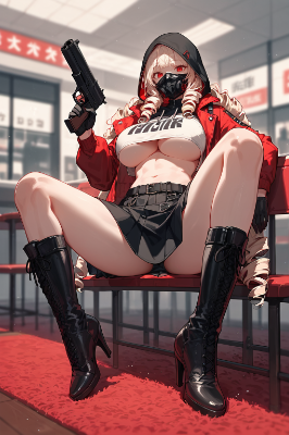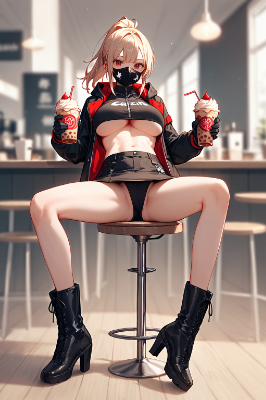score_9,score_8_up,score_7_up,doyagao,twin drills hair,,a girl holding a Parfait,warking,1girl,solo,holding,breasts,red eyes,jacket,skirt,hoodie,black footwear,mask,high heels,underboob,black skirt,large breasts,black gloves,boots,(detailed background),((depth of field)),(photography),<lora:ColorRoughSlider:-0.8>,from side,Cafe,