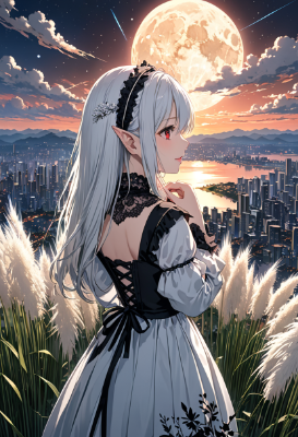 8K,((Moon Viewing,Retrospective,masterpiece,best quality,Ultra extremely detailed,perfect anatomy,detailed,high resolution)),((nape of neck,from_above,Child elf wearing see-through detailed retro gothic lolita dress )),((bowing deeply)),opening mouth,smile,blush,lipstick,full fresh lips,big hip,armpit,((red_Eye:1.5, Eye Reflections, reflect strong highlight in eyes)), solo, shining long white hair dropping,hair_band,BREAK,Japanese pampas grass,(bouquet),many flowers,sunrise,big planet of earth, big moon,((shooting_star)),meteor shower,clouds,retro city in distance,<lora:hairdetailer:1> <lora:make25d_type1_v100:1>,,,,,,