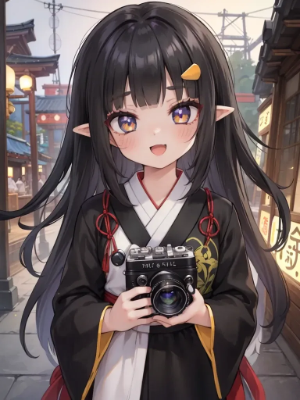 8K,(masterpiece),high resolution,best quality,(ultra-detailed),ultra detailed eyes,girl is elf,(black color hair:1.3),(inner hair color is white :1.8),(scowl:1.2),(smile,blush),(earth eyes:1.4),(long elf ear),open mouth,wear black fantasy coat and Turtleneck shirt,(eat white udon,Raw egg on top of white udon noodles,Holding a chopstick:1.4),in the food restaurant,