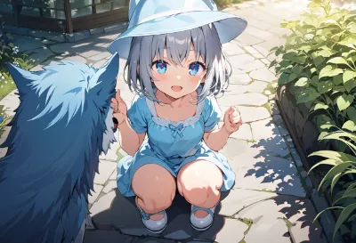 masterpiece, best quality, great, highly detailed CG unity 8k wallpaper, depth of field, (super fine illustration:1.5), illustration, CG, 2D, (Anime Style:1.2), extremely detailed 1 girl with little wolf, squatting, from front, from above, extremely detailed face, kawaii, happy smile, open mouth, (light pink lips: 0.8), short bob cut hair, (gray hair), (ice blue eyes:1.2), detailed eyes, cute face, kawaii, medium breasts, slender body, slender legs, delicate hair, shiny hair, shiny skin, nice hands, Holding her wolf, (dress), (little wolf:1.2), hat, outdoor, <lora:saturation:0.5> <lora:eyecolle_artemisia_v100:0.7> <lora:yawanuri:1> <lora:flat2:0.3> <lora:hairdetailer:0.7>