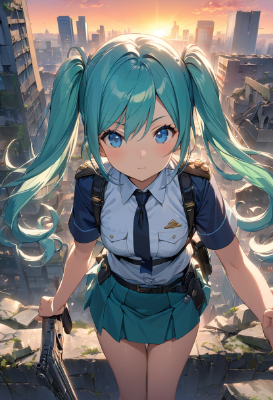 masterpiece, best quality, extremely detailed, anime, girl, skirt,初音ミク,vocaloid,mini skirt,twintail,longhair,blue hair,green hair,blue eyes,police, atyou, atyou, atyou <lora:AimingAtYouV1:1> <lora:AimingAtYouV1:1>,<lora:AimingAtYouV1:1>, atyou,evening sun,sunset,motorcycle,street,sea