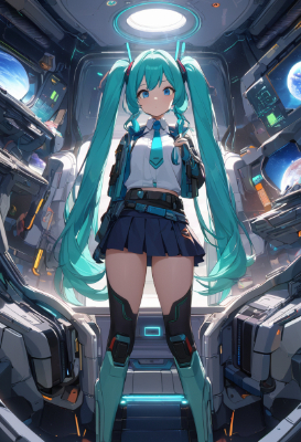 masterpiece, best quality, extremely detailed, anime, girl, skirtHatsune Miku, vocaloid, tie, 1girl, twin tails, long hair, blue hair, green hair, blue eyes, space, planet, inside a spaceship, machine,mini skirt,twintail,longhair,science fiction,cyberpunk,police