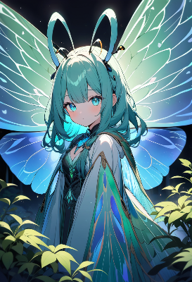 1girl, anime-style, insect-themed girl with delicate wings resembling a butterfly, detailed and expressive face, her eyes shimmering with an iridescent glow, her arms and legs featuring intricate patterns like those of beetles or dragonflies, wearing an outfit inspired by nature with a carapace-like texture, her hair flowing gently with antennae peeking through, background featuring a mystical forest filled with bioluminescent plants, the atmosphere is mysterious and enchanting, masterpiece, best quality, highly detailed, ultra-detailed, 8k resolution, intricate details, sharp focus, refined details, perfect composition, beautifully detailed, high resolution, exceptional quality, stunning detail, rating:general, (insect wings:1.4), (antennae:1.3), (bioluminescent forest:1.3)
