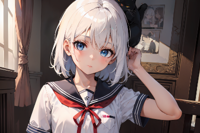 very cute female child,10 yo,white hair,bangs,medium hair,hair ribbon,blue eyes,flat chest,