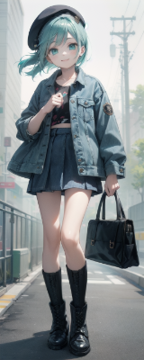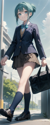 masterpiece, best quality, highres, 1otoko no ko, solo, (navy blue blazer:1.3), yellow cardigan, (brown pleated skirt:1.3), navy blue knee-high socks, loafers, school bag, かわいい, flat chest, aqua hair, aqua eyes, half updo, smile, 16 yo, nice hands, perfect hands, sky, walking<lora:flat2:0> <lora:hairdetailer:0.5><lora:GoodHands-vanilla:1>