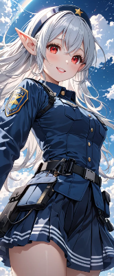 8K,((Retrospective,masterpiece,best quality,Ultra extremely detailed,perfect anatomy,detailed,high resolution)),((from below:1.5,Child elf wearing see-through police suit skirt )),opening mouth,smile,blush,lipstick,full fresh lips,big hip,armpit,((red_Eye:1.5, Eye Reflections, reflect strong highlight in eyes)), solo, shining long white hair,hair_band,BREAK,many flowers,big moon,((shooting_star)),clouds,city in distance,<lora:hairdetailer:1> <lora:make25d_type1_v100:1>,,,,,,