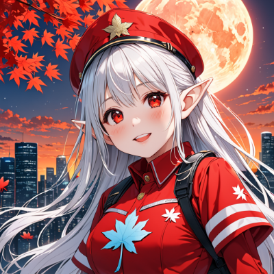 8K,((Retrospective,masterpiece,best quality,Ultra extremely detailed,perfect anatomy,detailed,high resolution)),((Close-up head:1.5,Child elf wearing see-through red police suit skirt )),opening mouth,smile,blush,lipstick,full fresh lips,big hip,small breasts,((red_Eye:1.5, Eye Reflections, reflect strong highlight in eyes)), solo, shining long white hair,hair_band,BREAK,many maple_ leaves,sunset,red,many flowers,big moon,((shooting_star)),clouds,city in distance,<lora:hairdetailer:1> <lora:make25d_type1_v100:1>,,,,,,