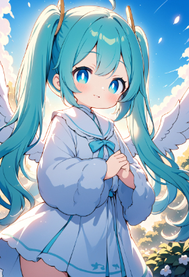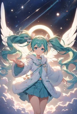 masterpiece, best quality, extremely detailed, anime, girl, Illustration of Hatsune Miku, vocaloid, 1girl, twin tails, long hair, blue hair, green hair, blue eyes, healing angel. The character is an angel with pure white wings and a fluffy, pastel-colored robe. She extends her hand with a gentle smile, and a warm light spreads all around her. There are soft, shining wings behind it, and the energy of an angel envelops the entire area.,mini ,skirt,twintail,longhair,sky,space,starry sky,night
