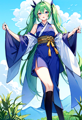 masterpiece, best quality, extremely detailed, anime, girl, Illustration of Hatsune Miku, vocaloid, 1girl, twin tails, long hair, blue hair, green hair, blue eyes, healing angel. The character is an angel with pure white wings and a fluffy, pastel-colored robe. She extends her hand with a gentle smile, and a warm light spreads all around her. There are soft, shining wings behind it, and the energy of an angel envelops the entire area.,mini ,skirt,twintail,longhair,sky,ry sky,blue sky,clear sky