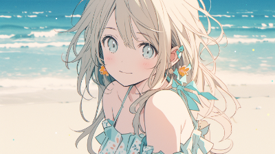 穏やかな波音が響く海辺で、優しい微笑みを浮かべる少女。髪をなびかせる海風と、鮮やかな花のアクセサリーが彼女の可憐さを際立たせる。透明感のある夏の光と共に、心地よいひとときを過ごす彼女の姿は、まるで一瞬を切り取った夏の思い出のよう。