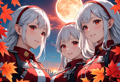Fashionable,8K,((Retrospective,masterpiece,best quality,Ultra extremely detailed,perfect anatomy,detailed,high resolution)),((upper body:1.5,salute little elves wearing see-through red police suit skirt )),opening mouth,smile,blush,lipstick,full fresh lips,big hip,small breasts,((red_Eye:1.5, Eye Reflections, reflect strong highlight in eyes)), two elves, shining long white hair,hair_band,flower print,BREAK,many maple_ leaves,sunset,red,many flowers,big moon,((shooting_star)),clouds,city in distance,<lora:hairdetailer:1> <lora:make25d_type1_v100:1>,,,,,,,,