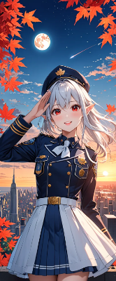 Fashionable,8K,((Retrospective,masterpiece,best quality,Ultra extremely detailed,perfect anatomy,detailed,high resolution)),((upper body:1.5,salute, two little elves wearing see-through blue stripe police suit skirt )),opening mouth,smile,blush,lipstick,full fresh lips,big hip,small breasts,((red_Eye:1.5, Eye Reflections, reflect strong highlight in eyes)), shining long white hair,hair_band,flower print,BREAK,many maple_ leaves,sunset,red,many flowers,big moon,((shooting_star)),clouds,city in distance,<lora:hairdetailer:1> <lora:make25d_type1_v100:1>,,,,,,,,,,