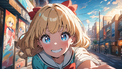 1girl,solo,walking,short hair,blonde hair,blue eyes,(hair bow:1.4),red bow,backpack,city background,street,(posters sticking out of backpack:1.2),backpack,(rolled posters:1.4),anime style,cute,cheerful expression,detailed clothing,(wind blowing hair:1.1),sunlight,urban environment,sidewalk,buildings,(pastel color palette:1.1),dynamic pose,full body shot,looking ahead,confident stance,casual outfit,sneakers,(soft lighting:1.2),depth of field,(vibrant atmosphere:1.3),slice of life,youthful energy,(masterpiece:1.4),(best quality:1.4),(very aesthetic:1.3),(absurdres:1.2),