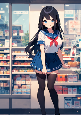 masterpiece, best quality, extremely detailed, illustration, anime screencap, cute, kawaii, girl, (((black hair))), (long hair), green eye, ((large breasts)), red micro bikini, ring, mini skirt, smile, outdoor, street, summer, see-through