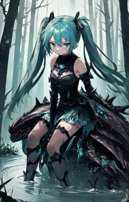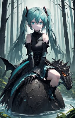 masterpiece, best quality, extremely detailed, anime, girl, Hatsune Miku, vocaloid, 1girl, twin tails, long hair, , , , female knight in black armor who straddles a black dragon, dark forest, night, desolate earth, world,twintail,longhair,rain,brown,horror,fantasy,wet hair,blue hair,green hair,blue eyes