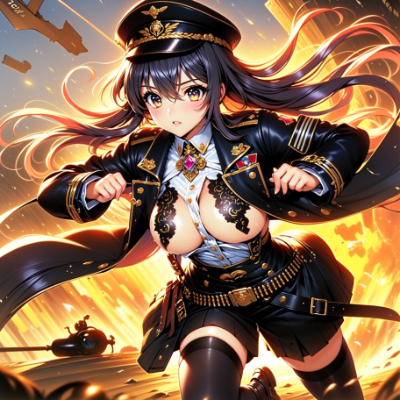 (eye contact:1.8), An anime-style illustration of a young girl dressed in a military uniform, standing on a war-torn battlefield. She has long, flowing blonde hair and bright blue eyes. The uniform is detailed with military decorations and a hat featuring an eagle insignia. She is saluting with a serious expression, looking out over the battlefield, where tanks, debris, and warplanes fill the background. The sky is filled with smoke and clouds, giving a sense of destruction and chaos. The overall atmosphere is dramatic and intense, with a focus on the girl's resolve and bravery amidst the devastation, Meticulous Eyelash Details, an extremely cute and beautiful girl, very Cute face, ((((big tits)))), big ass, white thighhighs, breasts apart, breast curtains, sideboob, underboob, nice hands, perfect hands, more prism, vibrant color,(perfect eyes:0.8), (detailed eyes:1),intricate colors, vibrant colors, color detail,The girl I like the most