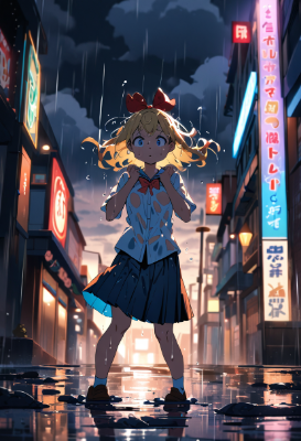 1girl,solo,(blonde hair:1.2),short hair,(blue eyes:1.1),(hair bow:1.4),red bow,(young:1.1),(petite:1),(school uniform:1.2),(white shirt:1.1),(pleated skirt:1.1),(large umbrella:1.3),(standing under umbrella:1.2),(rainy day:1.3),(light rain:1.2),(drizzle:1.1),(puddles:1.1),(reflections in water:1),(cloudy sky:1.1),(gray clouds:1.1),(raindrops:1.2),(wet ground:1.1),(city street:1.1),(looking up at sky:1.2),(worried expression:1.2),(slightly furrowed brows:1.1),(pouting:1),(arms holding umbrella handle:1.1),(hands gripping umbrella:1.1),(feet close together:1),(tiptoes:0.9),(full body view:1.1),(anime style:1.4),(2D art:1.3),(soft colors:1.2),(pastel palette:1.1),(muted tones:1),(detailed linework:1.2),(soft shading:1.1),(gentle lighting:1.1),(overcast lighting:1),(diffused light:1),(wet hair:1.1),(slightly messy hair:1),(hair moving slightly:1),(skirt swaying:1),(clothes slightly wrinkled:1),(water droplets on umbrella:1.2),(umbrella material texture:1.1),(transparent umbrella:1),(umbrella ribs visible:0.9),(city buildings in background:1),(blurred background:1),(depth of field:1.1),(street lamp:1),(traffic light:0.9),(store fronts:1),(vending machine:0.9),(bus stop:1),(rain gutter:1),(drainpipe:0.9),(wet leaves:1),(steam from drains:1),(mist:1.1),(small splash:1),(ripples in puddles:1.1),(wet asphalt:1.1),(glistening surfaces:1),(water running down umbrella:1.1),(small water droplets on clothes:1),(damp hair ends:1),(slightly rosy cheeks:1),(long eyelashes:1),(detailed eyes:1.1),(light reflections in eyes:1),(soft lips:1),(delicate nose:1),(small hands:1),(slender fingers:1),(clean fingernails:0.9),(school bag:1.1),(bag strap across chest:1),(school shoes:1),(wet shoelaces:0.9),(socks:1),(knees slightly bent:1),(shoulders slightly raised:1),(collar slightly askew:1),(ribbon slightly crooked:1),(masterpiece:1.4),(best quality:1.4),(very aesthetic:1.3),(absurdres:1.3),
