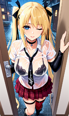 ultra detailed, masterpiece, best quality, aesthetic, perfect lighting, beautiful face, beautiful eyes, cute eyes, shiny hair, 1girl, voluptuous body, large breasts, doamarie, blonde hair, twin tails, hair ornament, <lora:marierose-pdxl-nvwls-v1:0.8>, wet body, orange swimsuit, U neckline swimsuit, competitive swimsuit, cleavage, smile, open mouth, leaning forward, straddling float, dolphin float, floating on water, outdoor, pool, resort area