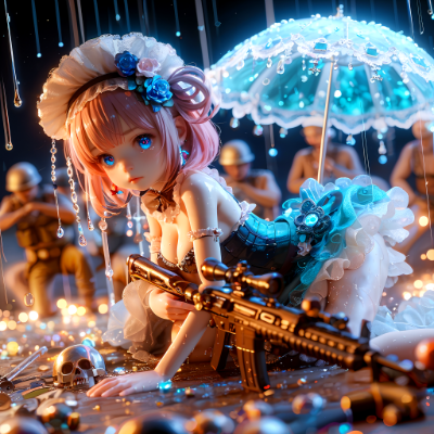 1girl ,10yo cute loli with (military soldier with naked Gothic Lolita taste open micro bikini armor aside, loss of war, heavy weapons, transparent frill race, stomach, navel, elegant tail hair), well-fleshed shiny skin, half closed glowing dark eyes, ball earrings, wet, drops, dark makeup, lips