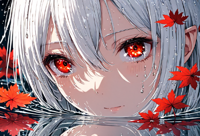 8K,((Retrospective,masterpiece,best quality,Ultra extremely detailed,perfect anatomy,detailed,high resolution)),((upper body:1.5, some Tiny elves wearing see-through blue stripe Lolita-Fashion, Military Look, skirt )),opening mouth,smile,blush,lipstick,full fresh lips,big hip,small breasts,((red_Eye:1.5, Eye Reflections, reflect strong highlight in eyes)), shining long white hair,hair_band,flower print,BREAK,many maple_ leaves,sunset,red,many flowers,big moon,((shooting_star)),clouds,rain,city in distance,<lora:hairdetailer:0> <lora:make25d_type1_v100:1> ,