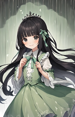 1 girl,(((very longest hair))),smile, Black hair,flowing hair,straight Hair,hair ribbon,mintgreen stripe,Black Eyes,flat chest,straight Across bangs,princess Cut, Very Long Sideburn,roundry Head,Droping eyes,cute,Meekness,Bob Cut,long back hair,12 years old,brown,