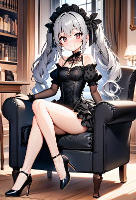 (best quality), (beautiful), (masterpiece), 1girl, petite, full body, (white gothic costume:1.3), ruffled off-the-shoulder dress, ruffled miniskirt, pumps, happy face, close mouth, brown hair, medium long hair, ponytail, hair ribbon, brown eyes, medium breasts, indoors, looking at viewer, sitting elegantly in the red couch, from side,