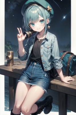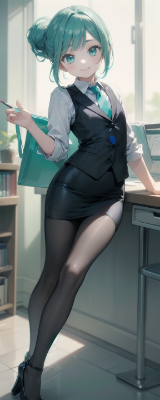 masterpiece, best quality, highres, 1otoko no ko, solo, yellow cardigan, sleeve past wrists, (brown pleated skirt:1.3), loose socks, loafers, school bag, かわいい, flat chest, (aqua hair:1.2), aqua eyes, half updo, 16 yo, nice hands, perfect hands, eating pizza, walking<lora:flat2:0><lora:hairdetailer:0.5><lora:GoodHands-vanilla:1> <lora:superbaggysocks:1>