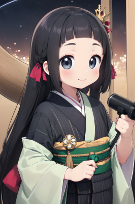 1 girl,(((very longest hair))),smile, Black hair,flowing hair,straight Hair,hair ribbon,mintgreen stripe,Black Eyes,flat chest,straight Across bangs,princess Cut, Very Long Sideburn,roundry Head,Droping eyes,cute,Meekness,Bob Cut,long back hair,12 years old,telescope