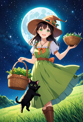 , colorful witch around who carries a large basket containing various kinds of medicinal herbs.. 、beige dress、緑色のマント、 dark brown long boots、 green eyes、 smile 、Bluestone Pendant、night、 starry sky、 moon、buddy black cat、grassland 、色とりどりの花々、extremely fine and beautiful colors, green hire, 8k,masterpiece, amazing sapraizz, ダイナミックな演出、映画の照明 <lora:saturation:1> <lora:make25d_type4_v100:1>