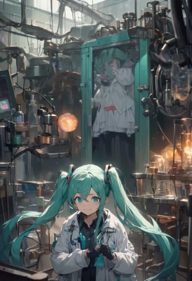 masterpiece, best quality, extremely detailed, anime, girl, Illustration of Hatsune Miku, vocaloid, 1girl, twin tails, long hair, blue hair, green hair, blue eyes, and a mad doctor girl. Scientist-like figure wearing a white coat, goggles, and gloves. Her hair is slightly disheveled, and she has a crazy smile on her face. Strange machines, experimental equipment, and chemicals line up in the background, creating an eerie atmosphere of the laboratory.,twintail,longhair,horror,血の付着した白衣。