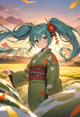 masterpiece, best quality, extremely detailed, anime, girl, Hatsune Miku, vocaloid, 1 girl, twin tails, long hair, blue hair, green hair, , girl wearing an autumn-colored kimono. Red dragonflies are flying over the golden-colored rice paddies. Higan flowers are blooming along the rice paddies. sunset sky,twintail,longhair,blue eyes,Japanese style,watercolor