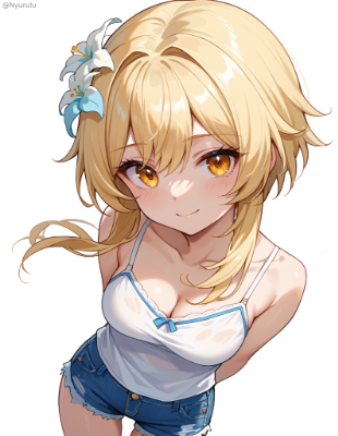 score_9, score_8_up, score_7_up,source_anime, 1girl,(lumine_\(genshin_impact\):0.8), medium_breasts, looking_at_viewer,light_smile, closed_mouth, cleavage, collarbone, BREAK, arms_behind_back, bare_shoulders, hair_flower, short_shorts, thigh_gap, blue_shorts, denim_shorts, cutoffs, white_camisole, spaghetti_strap, cowboy_shot, from_above, white_background,