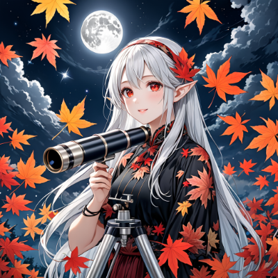 8K,((Retrospective,masterpiece,best quality,Ultra extremely detailed,perfect anatomy,detailed,high resolution)),(((close-up chest,plant print,children female elf wearing see-through dark dress skirt))),looking at viewer,elf ear,opening_mouth,smile,blush,lipstick,full fresh lips,big hip,small breasts,((red_Eye:1.5, Eye Reflections, reflect strong highlight in eyes)),shining long white hair,hair_band,flower print,touching on own head , with telescope,BREAK,many maple_leaves,many flowers,big moon,((shooting_star)),(((telescope))),dark clouds,flushing lightning,<lora:hairdetailer:0> <lora:make25d_type1_v100:1> ,