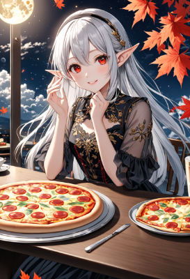8K,((masterpiece,best quality,Ultra extremely detailed,perfect anatomy,detailed,high resolution)),(((upper body,plant print,children female elf wearing see-through twincle dress skirt))),looking at viewer,elf ear,opening_mouth:1.4,smile,blush,lipstick,full fresh lips,big hip,small breasts,((red_Eye:1.5, Eye Reflections, reflect strong highlight in eyes)),waving shining long white hair,hair_band,touching own hip,BREAK,many maple_leaves,many flowers,big moon,((shooting_star)),clouds,flushing lightning,((twincle)),<lora:hairdetailer:0> <lora:make25d_type1_v100:1> ,,,