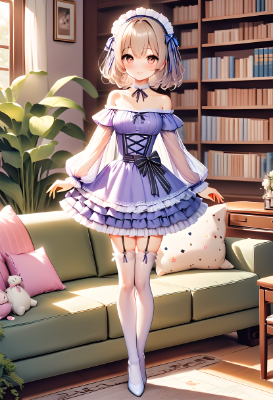 (best quality), (beautiful), (masterpiece), 1girl, petite, lovey, full body, (white bikini maid girl costume, miniskirt:1.3), happy face, open mouth, light brown hair, medium hair, light wave hair, brown eyes, large breasts, looking at viewer, sitting on the cushion, indoors, from front and side,