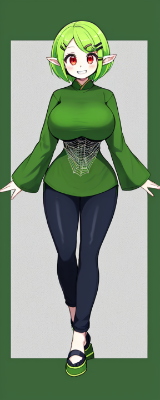 ((1girl)),((solo)),short hair,looking at viewer,smile,((green hair)),long sleeves,hair ornament,pale red eyes,((full body)),open clothes,pointy ears,hairclip,grin,two-tone hair,green shirt,((huge breasts)),standing,(身長168cm),Spider Woman,spider