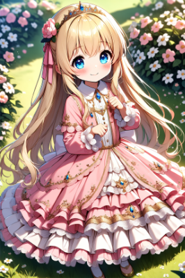 「1人のとても小柄な女性。とても背の低いお姫様で、とても長く明るい金髪、とても長くまっすぐ流れるようなストレートヘア。身長はとても低く、パステルピンクのドレスにはたっぷりとフリルが幾重にも重なり、長袖のパステルピンクのロングドレスは多くのフリルとレースと刺繍で豪華に飾られている。スカートの裾やウエスト部分にもフリルとレースと刺繍の装飾が豪華に施されて、裾まで華やかに広がっている。金銀や宝石のアクセサリーを多く付けている。非常に小柄な女性で可愛く、顔を赤くして優しく微笑んでいる。非常に低い背であり、湖の畔の草原に座って、可愛いポーズをしている。非常に長く明るい金髪が広がっている。青い目。季節は春。全体がアニメ風に描かれ、非常に詳細な描写。アスペクト比は縦長」の絵を描いて