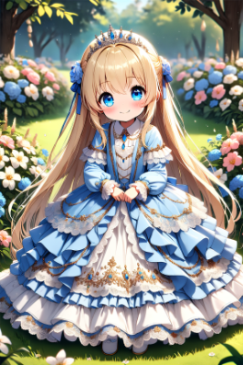 1girl little female child loli toddler preschooler blonde hair very long hair pink long dress pink gown pink princess dress pink layered dress frills embroidery lace-trimmed frilled lace long sleeves tiara jewelry gem princess blush smile closed mouth looking at viewer [blue eyes] standing on grass floral garden masterpiece best quality