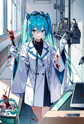 masterpiece, best quality, extremely detailed, anime, girl, ,suitIllustration of Hatsune Miku, vocaloid, 1girl, twin tails, long hair, blue hair, green hair, blue eyes, and a mad doctor girl. Scientist-like figure wearing a white coat, goggles, and gloves. Her hair is slightly disheveled, and she has a crazy smile on her face. Strange machines, experimental equipment, and chemicals line up in the background, creating an eerie atmosphere of the laboratory. A white coat with blood on it, and there is blood on the floor and walls.